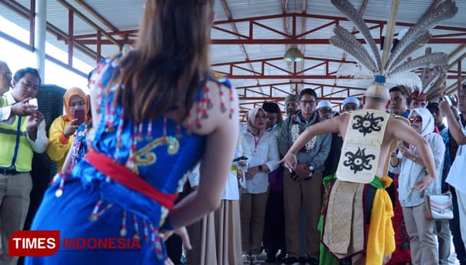 TIMES Kapuas/Cawapres Nomor urut 02, Sandiaga Salahuddin Uno disambut dengan upacara adat Tetek Pantan saat tiba di Bandara Tjilik Riwut Palangkaraya, Kalimantan, Senin (04/02/2019). (FOTO: Tofik For TIMES Indonesia)