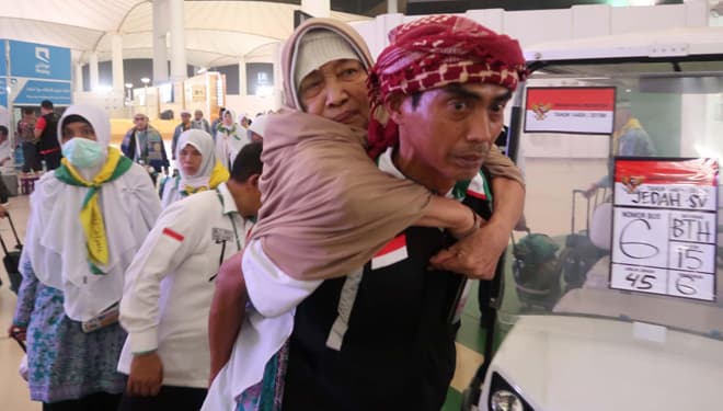 TIMES Kapuas/Petugas PPIH menggendong jemaah risti di bandara KAIA Jeddah, jelang pulang ke tanah air. (FOTO : istimewa).